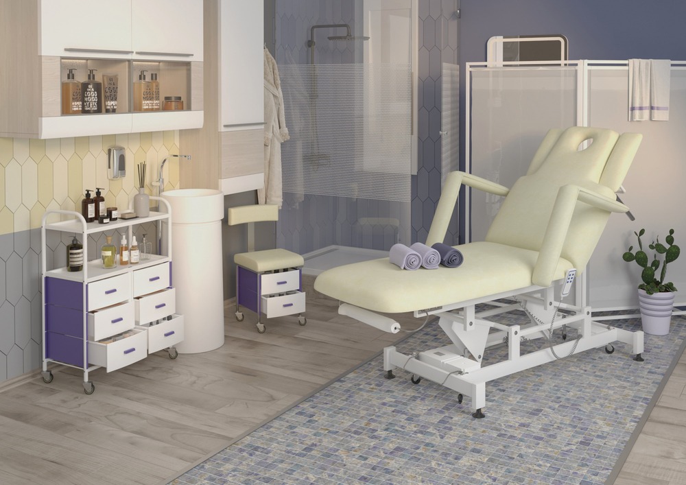 Кресло косметологическое Мэдисон Элегия-2А (МД-850) многофункциональное, электрическое, 2 мотора Обивка: выполнена из поролона, обивочный материал – влагоустойчивая экокожа. Подлокотники: съемные, с обивкой в цвет кушетки. Каркас: металл с влагозащитным антикоррозийным покрытием. Основание: на подпятниках, металлическое. Регулировка высоты: электромотор. Наклон спинки: электромотор. Кушетка массажная МД-850 с электроприводом (2 мотора) разработана для оказания услуг в косметологических и массажных кабинетах, СПА-центрах и других салонах в сфере индустрии красоты. Обивка мягких деталей из качественной экокожи, которая не требует специального ухода, легко чистится, устойчива к образованию пятен. В нашем магазине покупателям предоставляется возможность купить массажную кушетку МД-850 с электроприводом (2 мотора) под заказ с любым цветом обивки из предложенных вариантов экокожи. Кушетка разделена на два мягких сегмента, положение которых регулируется. С помощью двух встроенных электромоторов можно дистанционно регулировать угол наклона спинки и высоту кушетки. В комплект поставки входит удобный пульт управления электроприводом. Каркас и основание из металла с защитным покрытием.
