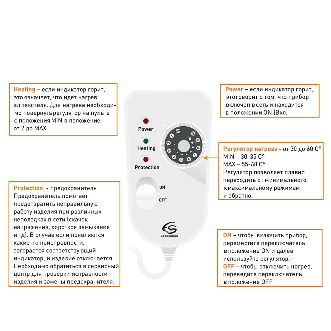 ТЕХНИЧЕСКИЕ ХАРАКТЕРИСТИКИ ЭЛЕКТРОПРОСТЫНЬ ECOSAPIENS SOFY 150Х120 СМ