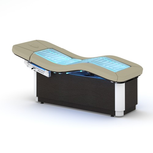Отдельного внимания заслуживает дизайнерское решение MLW Amphibia. Модель удачно сочетает классическую светлую отделку с яркими цветными элементами. По желанию заказчика стол может оснащаться разнообразными системами подсветки, наиболее подходящими под оформление конкретного интерьера. Прочная рама каркаса выполнена из металла, в качестве отделочного материала использована качественная экокожа, прекрасно зарекомендовавшая себя при активной и длительной эксплуатации. Под внешней обивкой находится мягкий наполнитель – поролон, он гарантирует максимальный комфорт и удобство пользователя во время процедур.