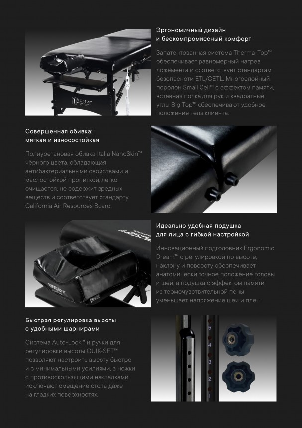 • Встроенный подогрев всей поверхности стола (технология Therma-Top®) с регулировкой температуры — для максимального комфорта клиента в любое время года.