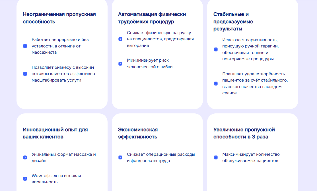 Робот способен двигаться по телу, полностью повторяя траектории движения ручного массажа, что никогда не сможет сделать, например, массажное кресло.